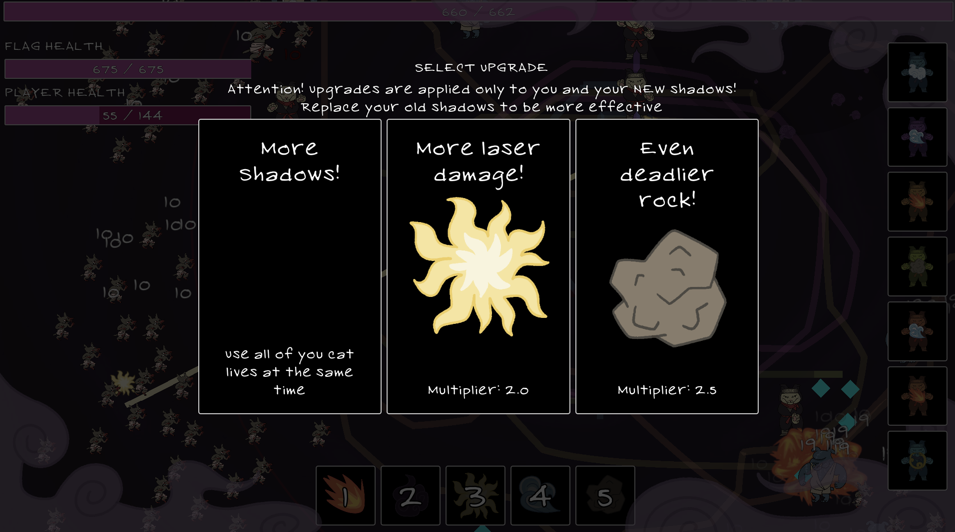 Press E to create a new shadow. Those are your shadow icons. The first one is already fighting for you, the second one will appear on the next cycle, and the third one is not used yet.